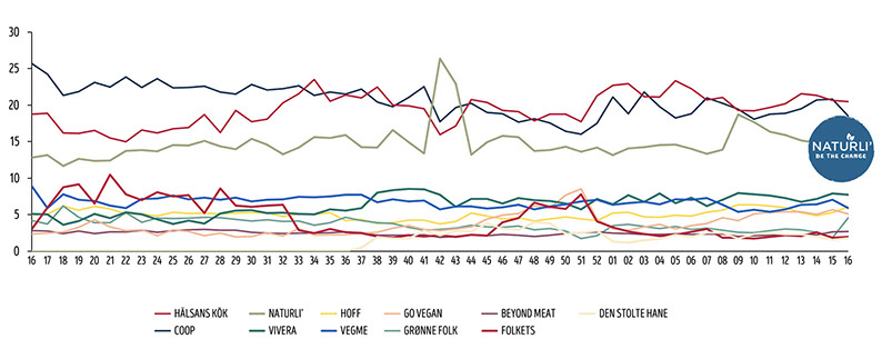 Nielsen, kjøtterstatning – 000’ Unit % Share Norge MAT, per u16 2022