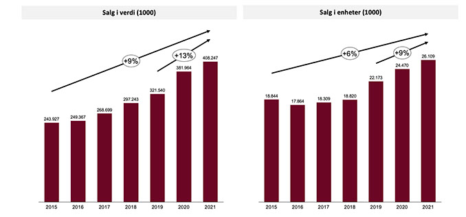 Kilde: NielsenIQ | Value sales (1000) | Unit sales (1000) Historiske Nielsendata fra 2015-2021. Veksten viser gjennomsnittlig årlig vekst.